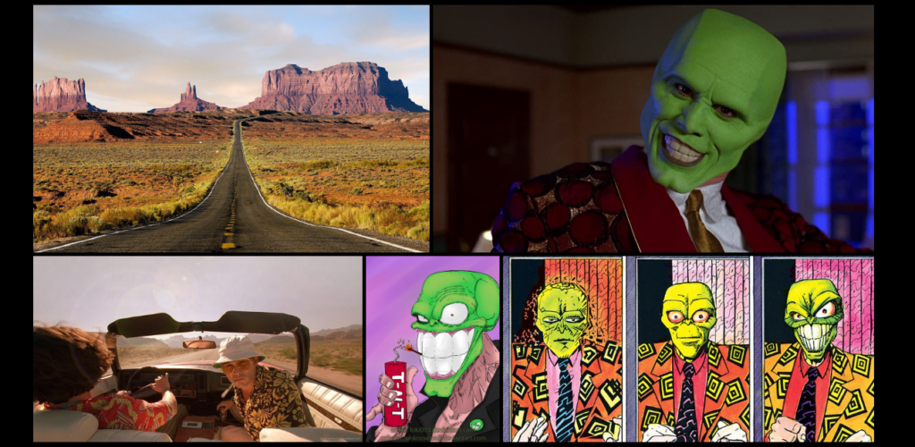 I wanted to incorporate the psychedelic style of The Mask into an illustration-based design, so I focused on highlighting key elements that stood out to me: the bats, cigarette, hat, and sunglasses.